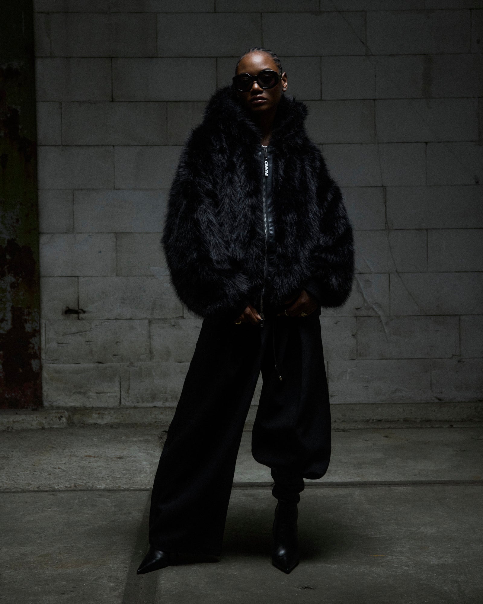 CINVINI - BLACK FURBY JACKET is unisex and made from 100% synthetic leather (outshell) and polyester (lining). It can be worn in multiple ways due to the 2-way zipper. Available in two colorways.